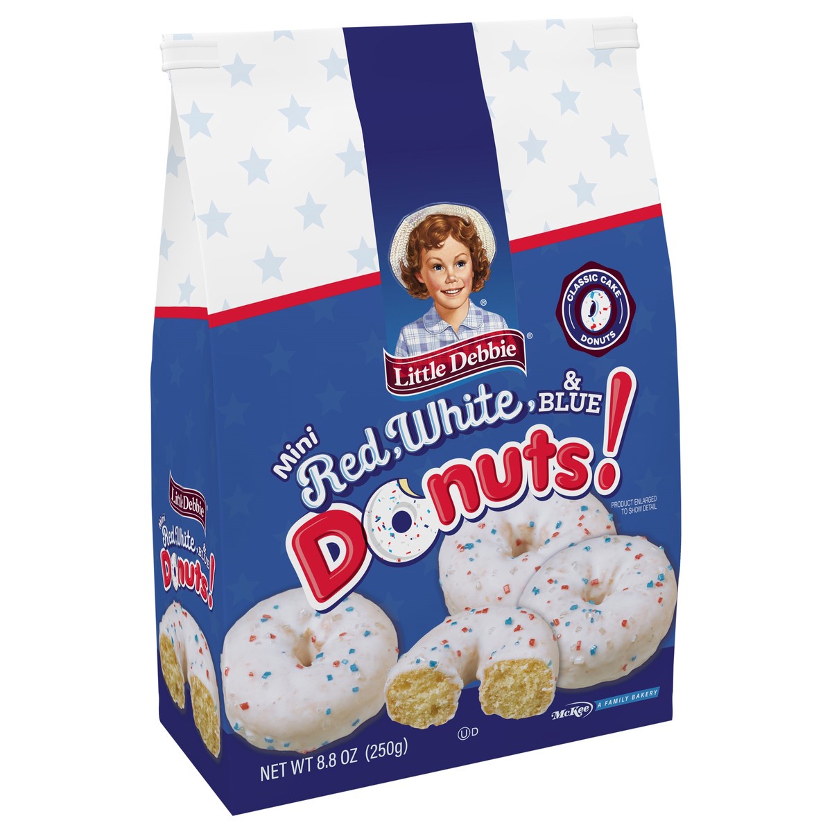 Little Debbie Red, White & Blue Donuts! The original cake donut, topped with white frosting and a mix of red, blue and silver sugar crystals, making them the perfect shareable snack for summer parties…