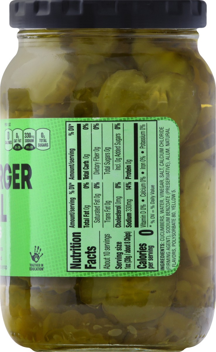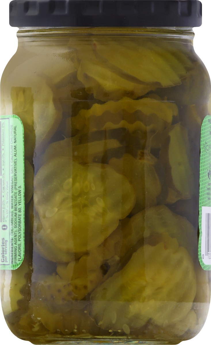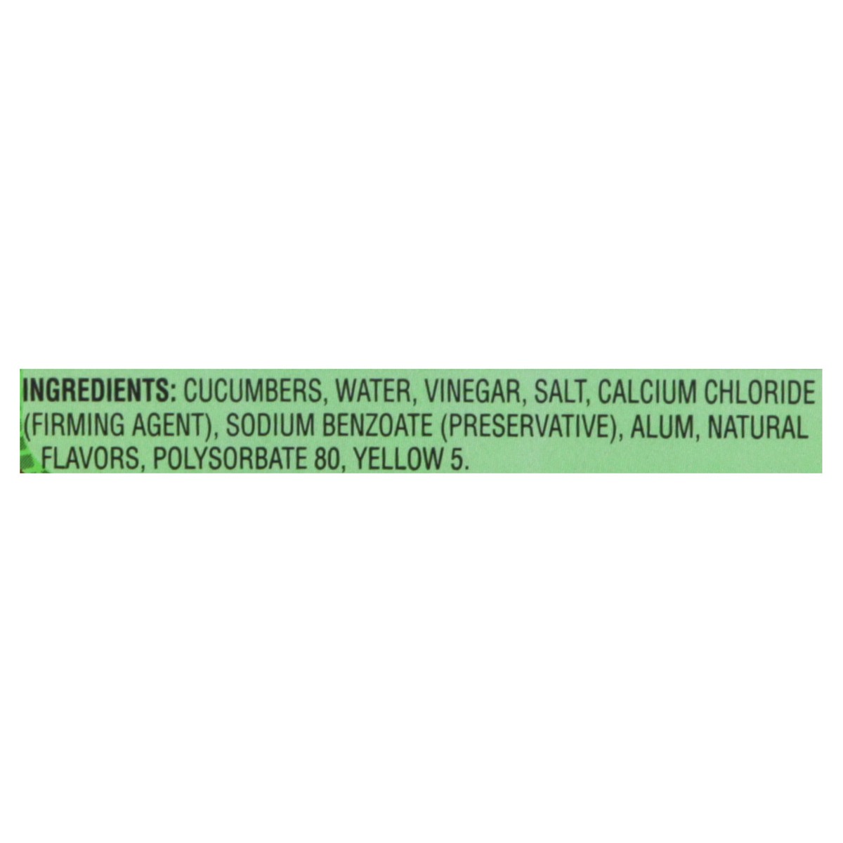 Cucumbers, Water, Vinegar, Salt, Calcium Chloride (Firming Agent), Sodium Benzoate (Preservative), Alum, Natural Flavors, Polysorbate 80, Yellow 5.