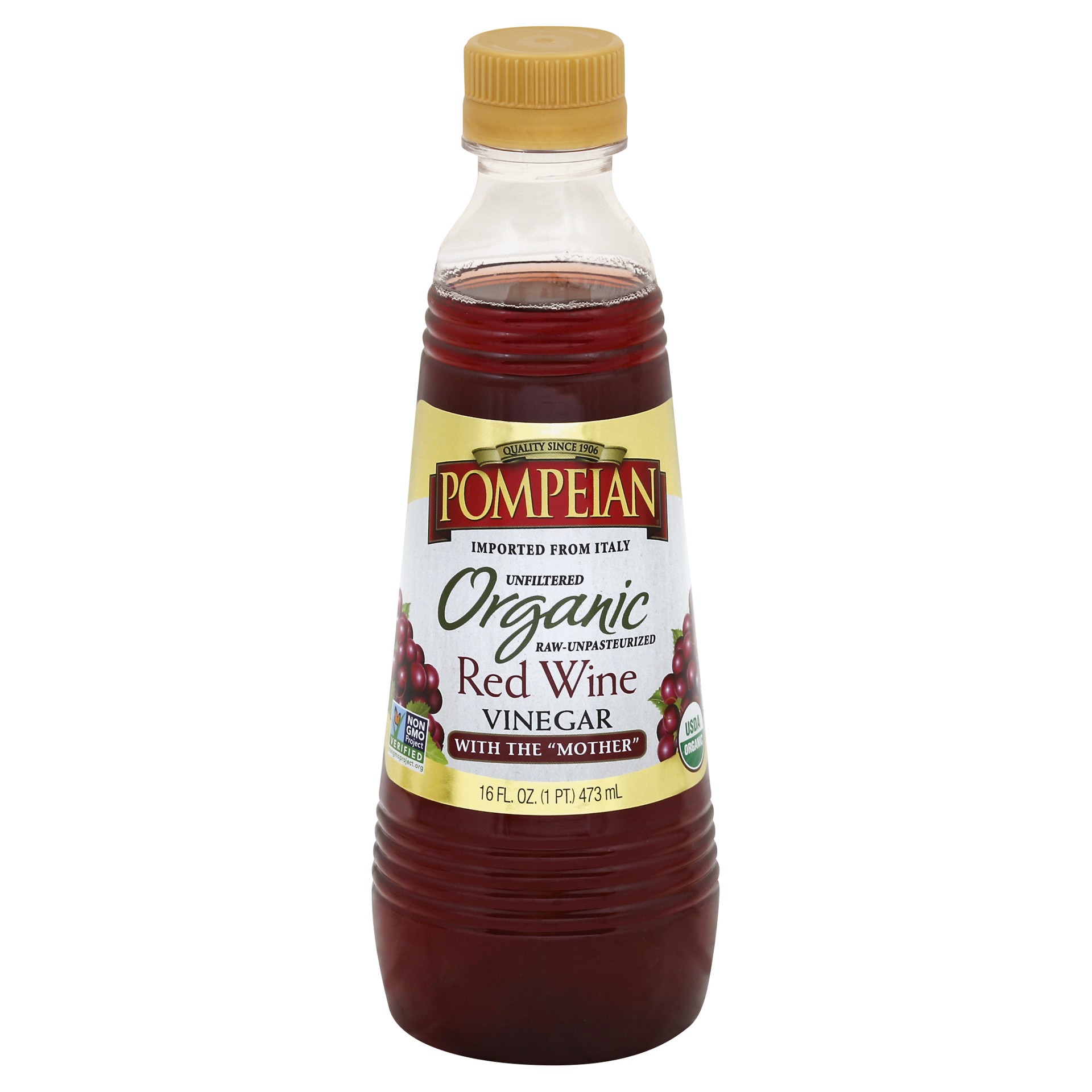 With the Mother. Unfiltered. Raw - unpasteurized. Non GMO Project verified. Nongmoproject.org. USDA organic. Quality since 1906. Pompeian's unfiltered, unpasteurized, organic red wine vinegar is produ…
