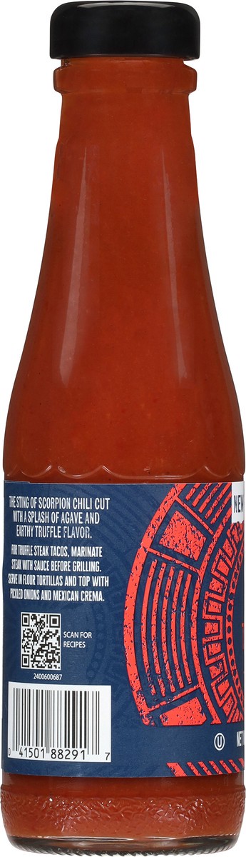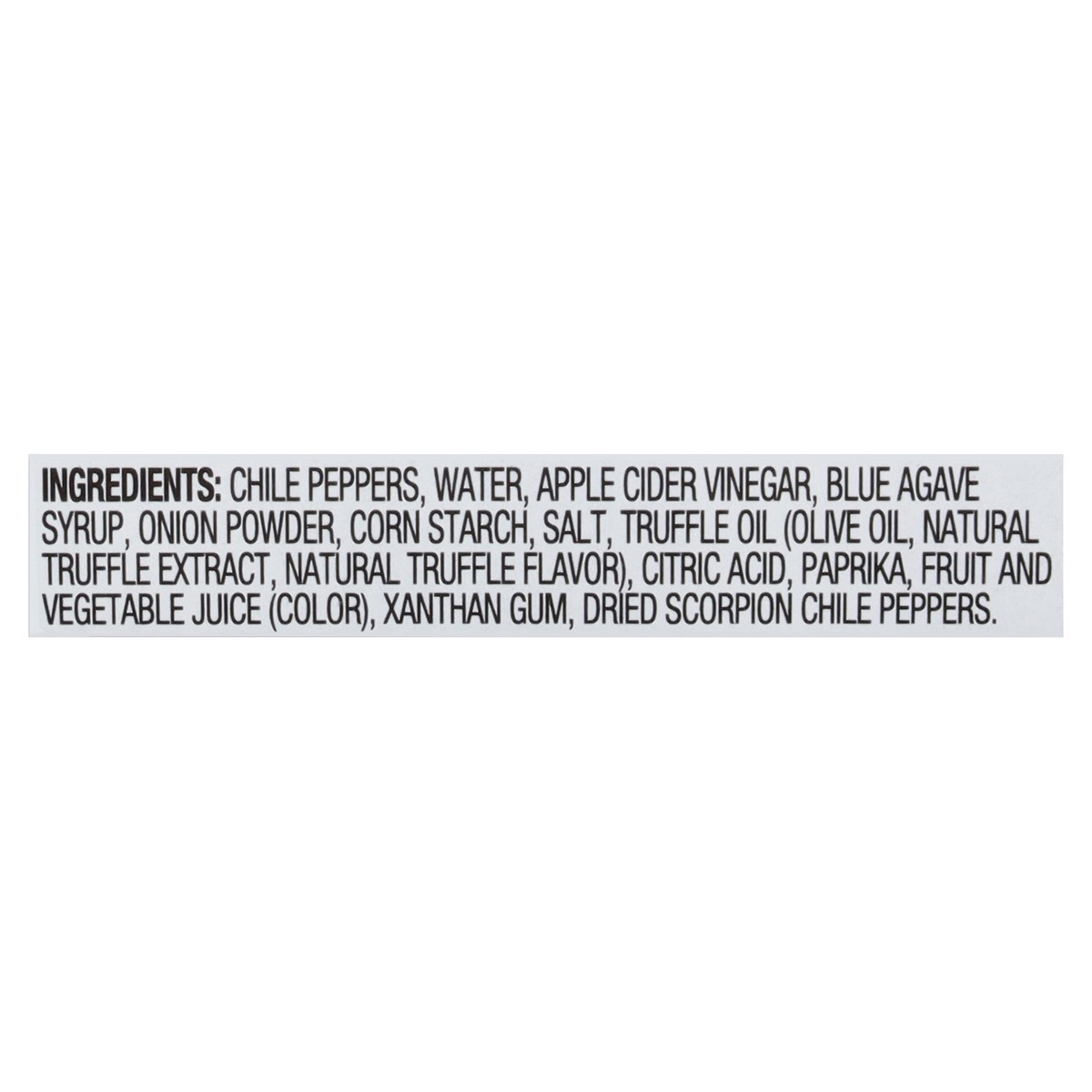 Chile Peppers, Water, Apple Cider Vinegar, Blue Agave Syrup, Onion Powder, Corn Starch, Salt, Truffle Oil (Olive Oil, Natural Truffle Extract, Natural Truffle Flavor), Citric Acid, Paprika, Fruit and …