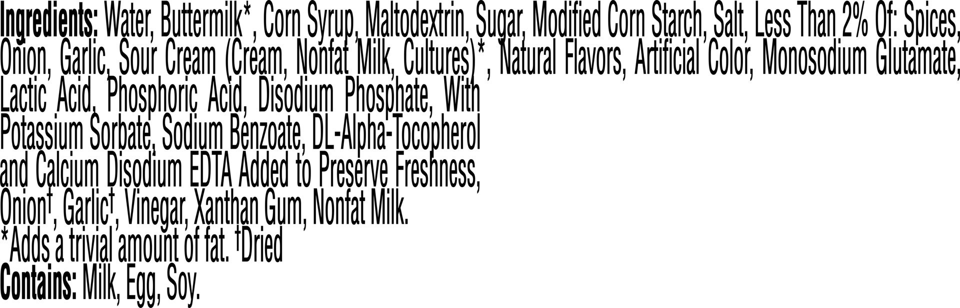 Water, Buttermilk*, Corn Syrup, Maltodextrin, Sugar, Modified Corn Starch, Salt, Less than 2% of: Spices, Onion, Garlic, Sour Cream (Cream, Nonfat Milk, Cultures)*, Natural Flavors, Artificial Color, …