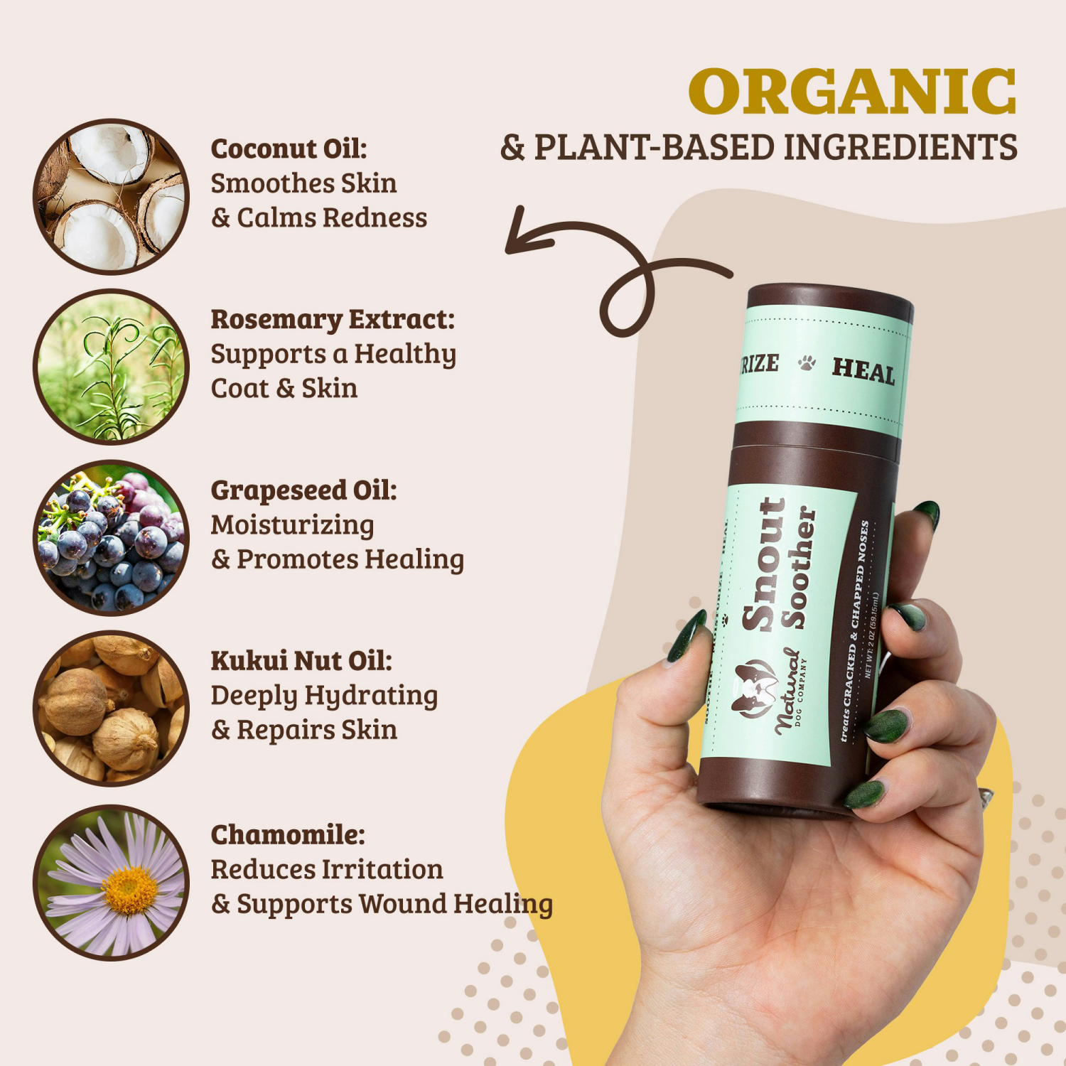 Snout Soother is the ideal remedy for healing and soothing dry, cracked, or scaly snouts. Nourishes your pup's sensitive sniffer, and heals cracked or broken skin, skin overgrowth, and hyperkeratosis.