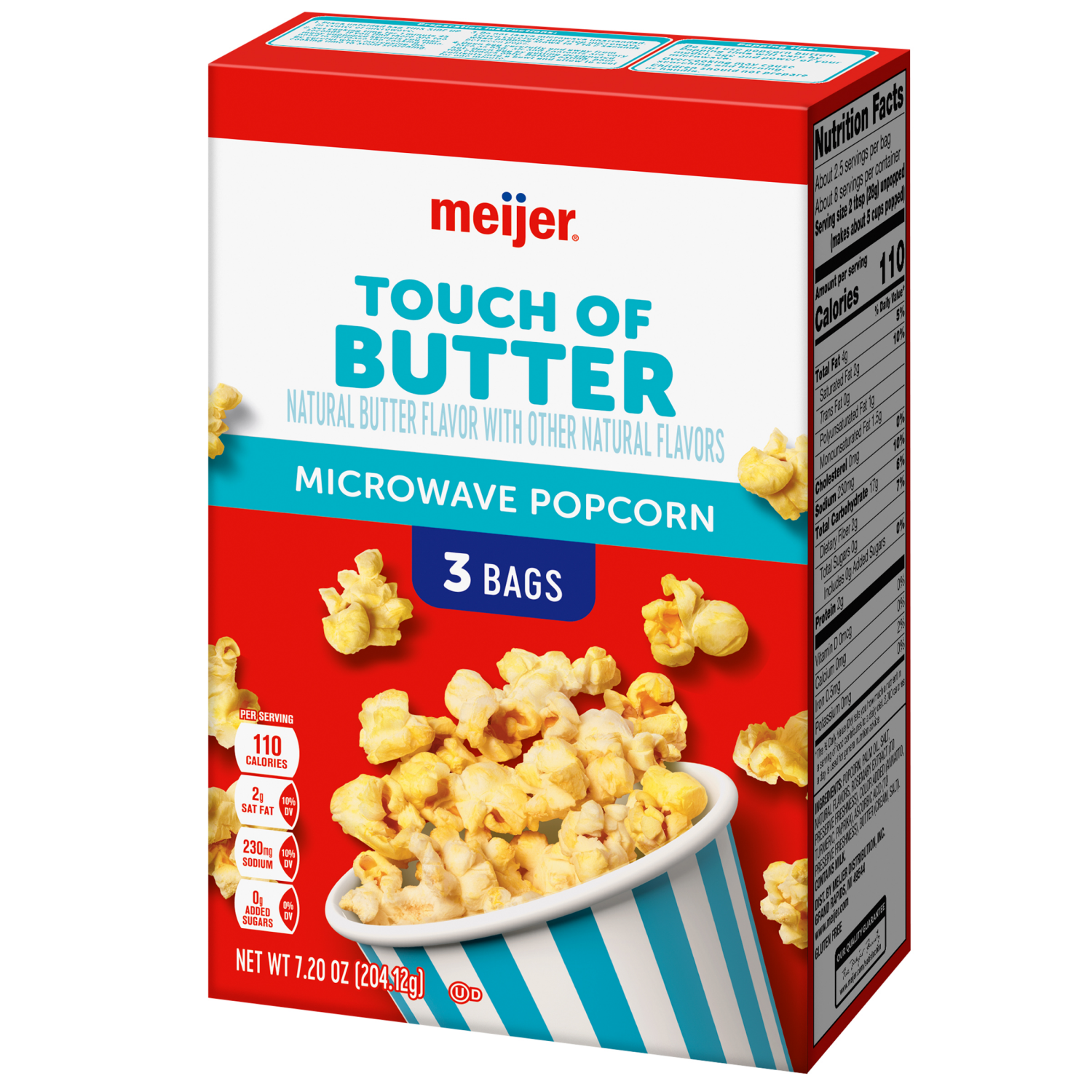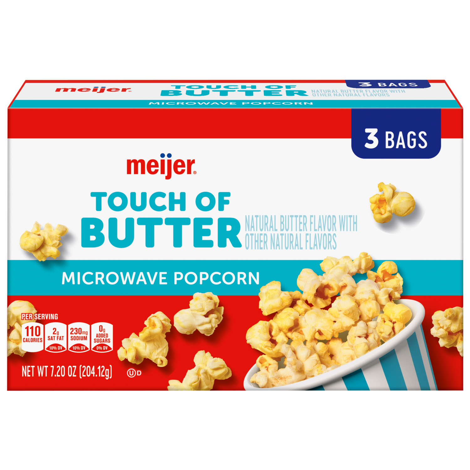 Bring the movie theater experience home with Meijer Touch of Butter Microwave Popcorn. Perfectly balanced with rich and savory flavors, this fresh-popped snack is conveniently ready in minutes. This l…