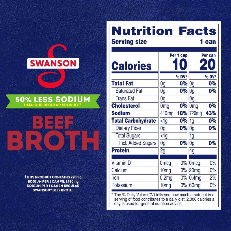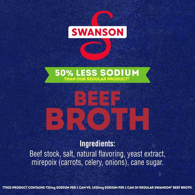 - 50% less sodium than regular Swanson® Beef Broth*. (*410 mg of sodium per serving versus 830 mg of sodium per serving in regular Swanson® Beef Broth)