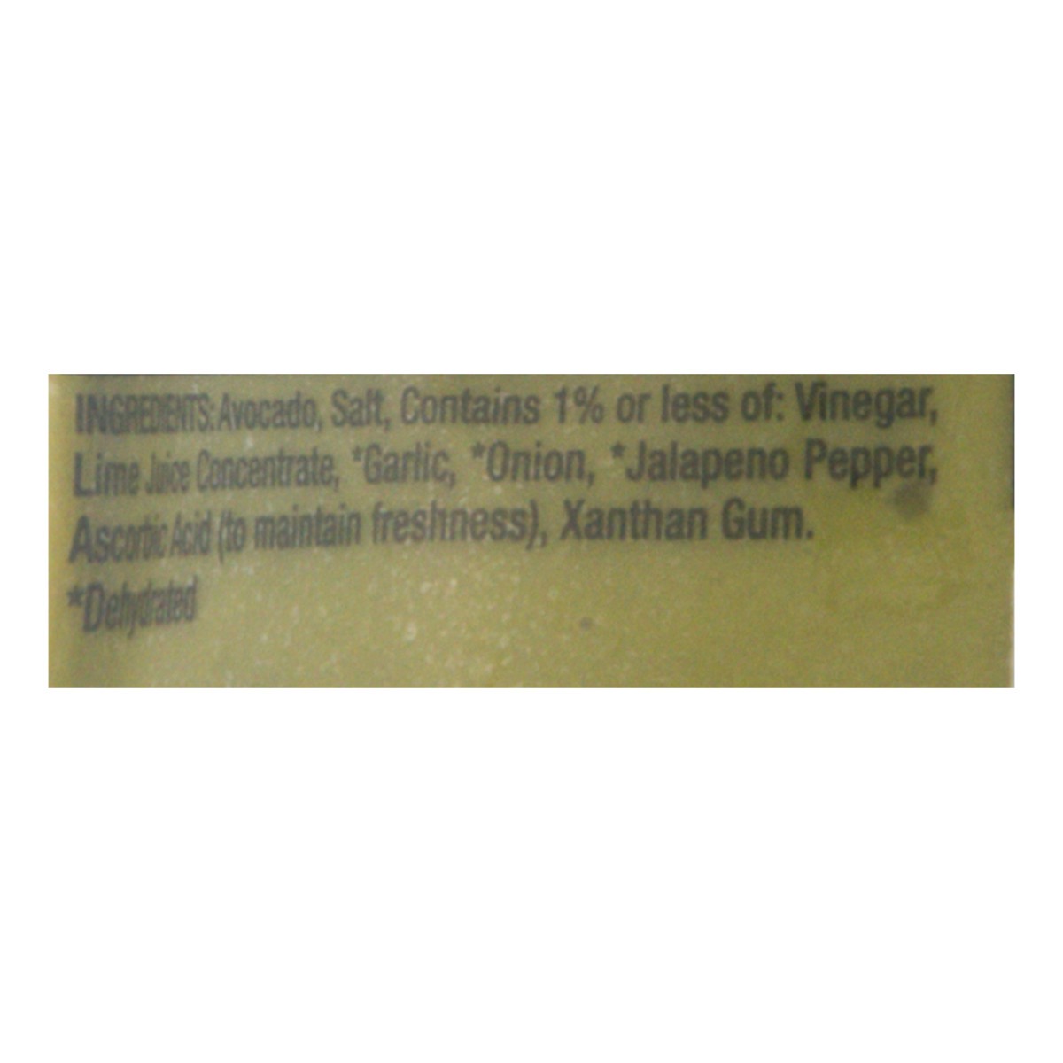 Avocado, Salt, Contains 1% or Less of: Vinegar, Lime Juice Concentrate, Garlic (Dehydrated), Onion (Dehydrated), Jalapeno Pepper (Dehydrated), Ascorbic Acid (to Maintain Freshness), Xanthan Gum.