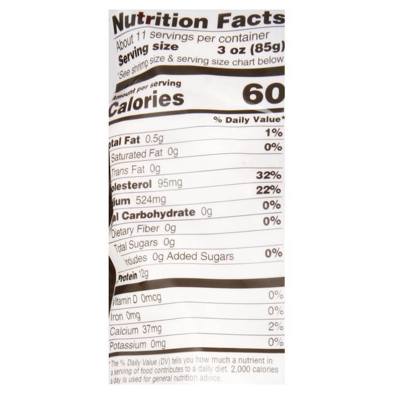 Peeled & deveined white shrimp. Per 3 oz Serving: 60 calories; 0.5 g fat (1%); 0 g carbs (0%); 12 g protein. 31-40 shrimp per pound. We go to the ends of the earth just to please you! Ready to eat. In…