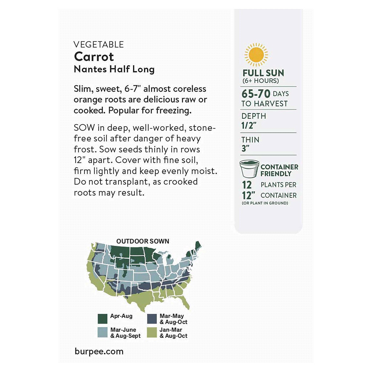 Slim, sweet, 6-7" almost coreless orange roots are delicious raw or cooked.
