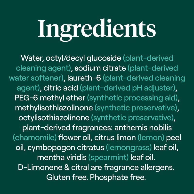 Water, octyl/decyl glucoside (plant-derived cleaning agent), sodium citrate (plant-derived water softener), laureth-6 (plant-derived cleaning agent), citric acid (plant-derived pH adjuster), PEG-6 met…