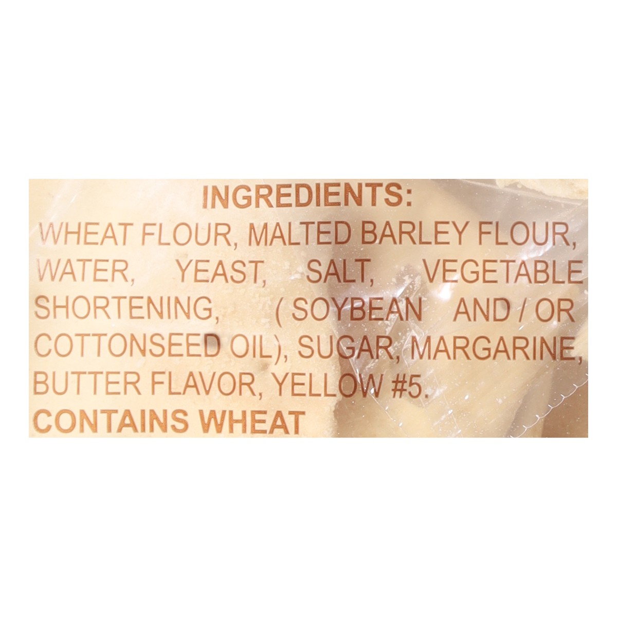 Wheat Flour, Malted Barley Flour, Water, Yeast, Salt, Vegetable Shortening, (Soybean and/or Cottonseed Oil), Sugar, Margarine, Butter Flavor, Yellow #5.