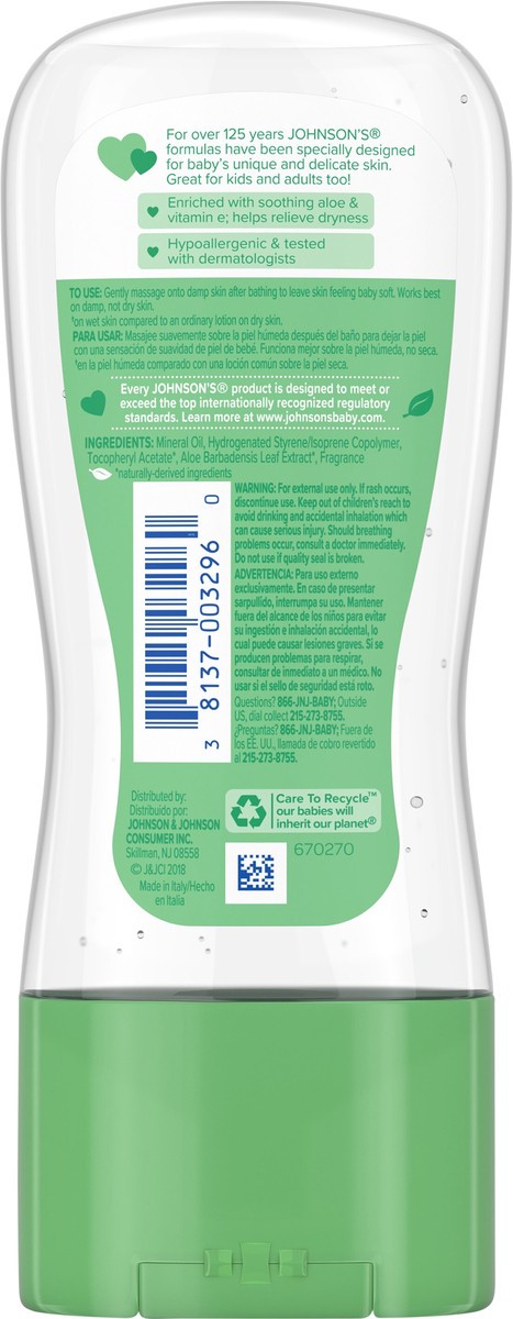 Johnson''s baby oil gel is enriched with natural Aloe Vera, known for its dry skin-soothing qualities, as well as Vitamin E, a known skin conditioner. This nourishing baby massage oil forms a silky ba…