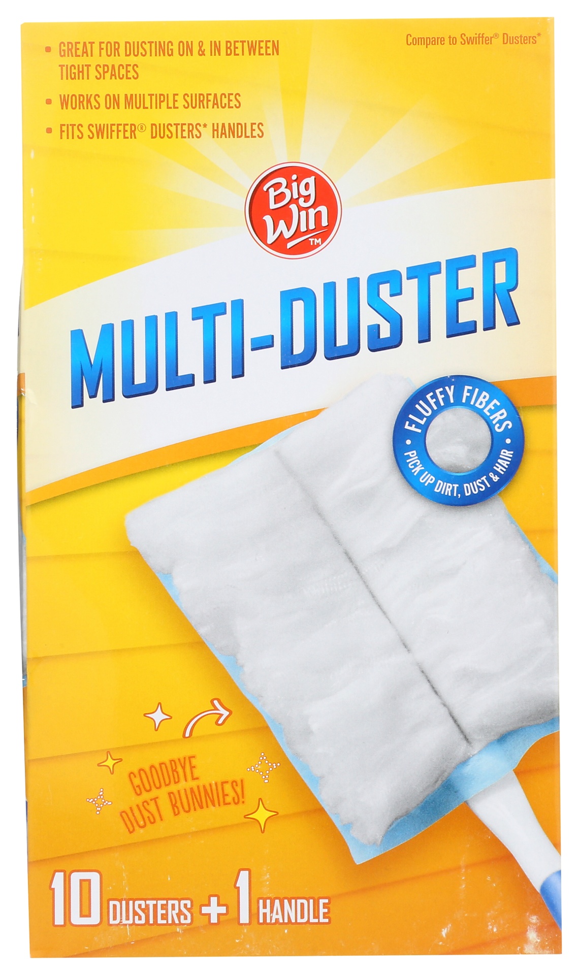 Big Win MultiDuster fits Swiffer duster handles. Use on any dry surface that attracts dust. Product comes with handle and ten dusters. Easy to use assemble handle parts, fluff duster to ruffle feather…
