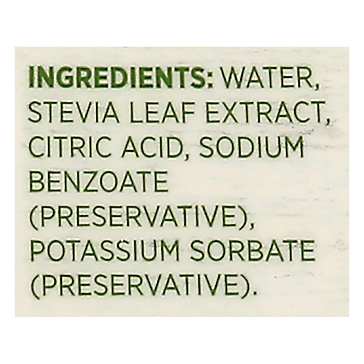 Water, Splenda Stevia Extract (Reb M), Citric Acid, Potassium Sorbate and Sodium Benzoate (Preservative).