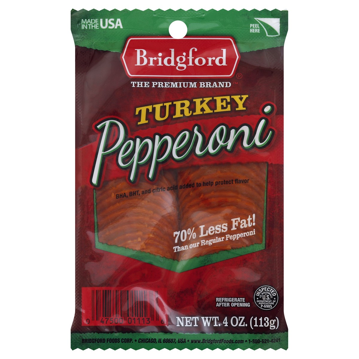 The premium brand. BHA, BHT, and citric acid added to help protect flavor. 70% less fat! Than our regular pepperoni. Inspected for wholesomeness by US Department of Agriculture. www.BridgfordFoods.com…