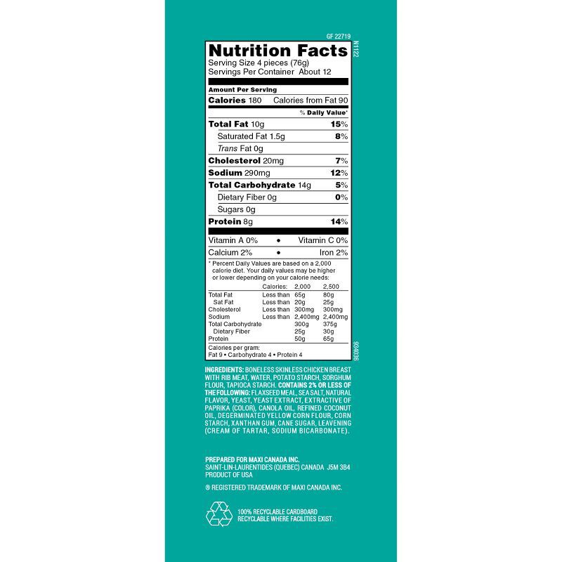 BONELESS SKINLESS CHICKEN BREAST WITH RIB MEAT, WATER, SORGHUM FLOUR, POTATO STARCH, TAPIOCA STARCH. CONTAINS 2% OR LESS OF THE FOLLOWING: FLAXSEED MEAL, SEA SALT, NATURAL FLAVOR, YEAST, YEAST EXTRACT…