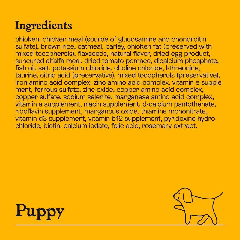 CHICKEN, CHICKEN MEAL (SOURCE OF GLUCOSAMINE AND CHONDROITIN SULFATE), BROWN RICE, OATMEAL, BARLEY, CHICKEN FAT (PRESERVED WITH MIXED TOCOPHEROLS), FLAXSEEDS, NATURAL FLAVOR, DRIED EGG PRODUCT, SUNCUR…