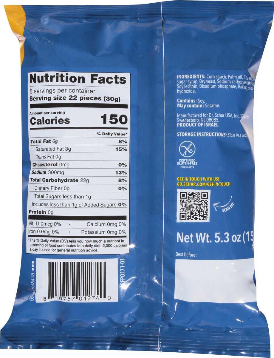 Classic salty snack. Gluten-free. Vegan. Certified gluten-free. New. Classic salty snack. Get int touch with us! go.schar.com/get-in-touch. Scan me. Product of Israel.