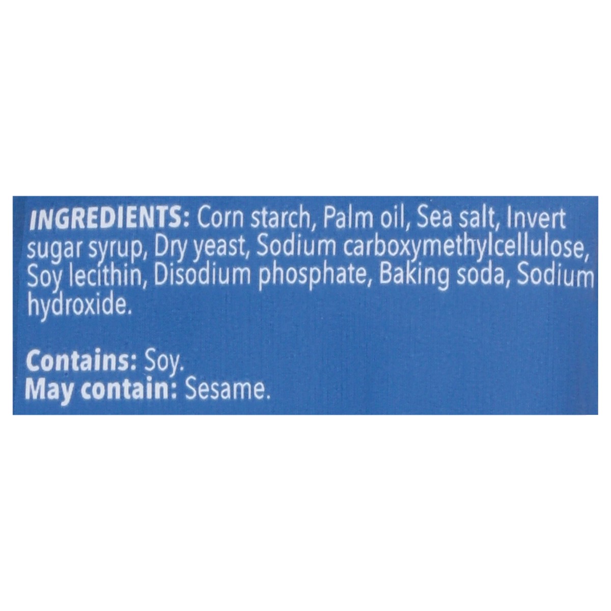 Corn Starch, Palm Oil, Sea Salt, Invert Sugar Syrup, Dry Yeast, Sodium Carboxymethylcellulose, Soy Lecithin, Disodium Phosphate, Baking Soda, Sodium Hydroxide.