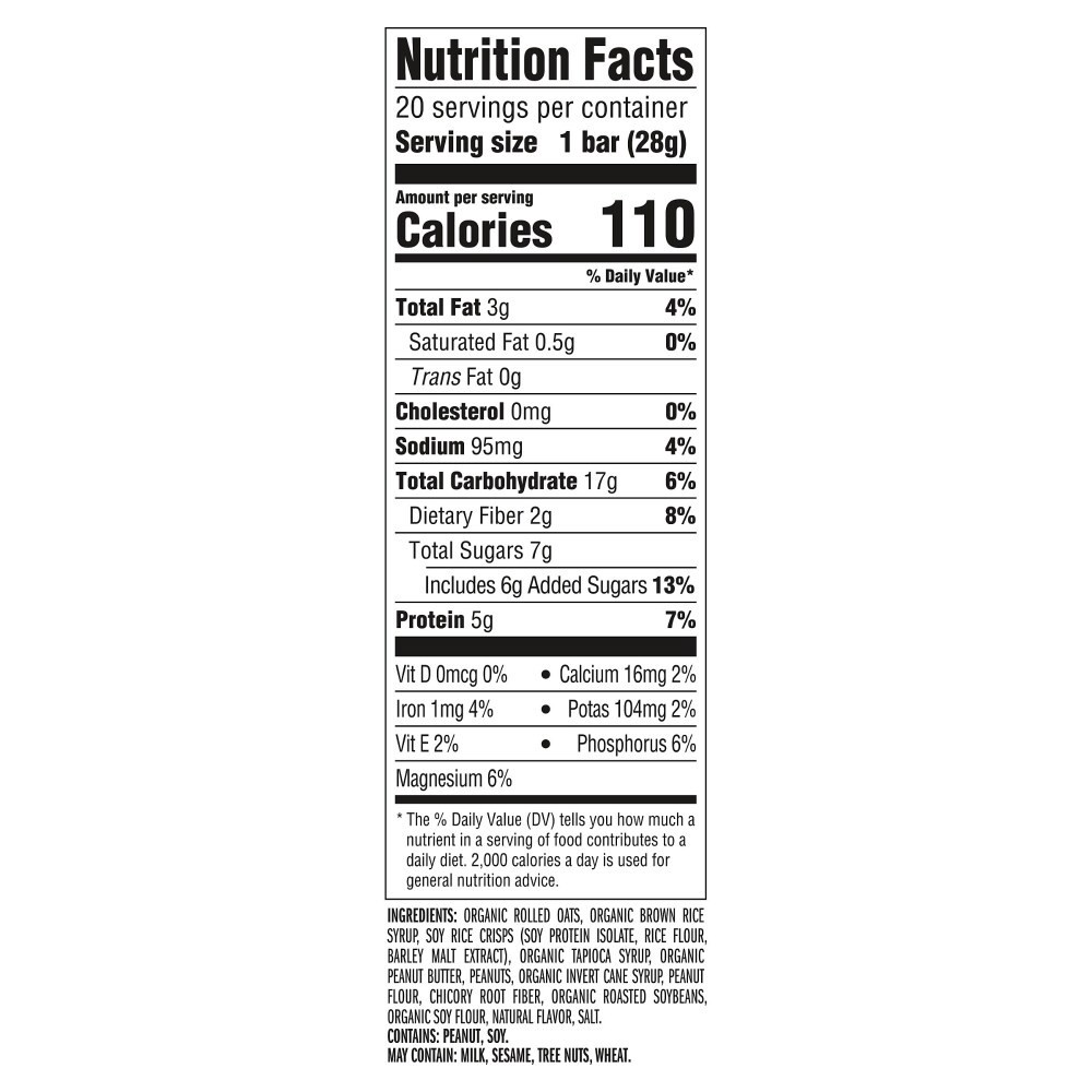Organic Brown Rice Syrup, Organic Rolled Oats, Organic Cane Syrup, Organic Peanut Butter, Organic Roasted Soybeans, Soy Protein Isolate, Peanuts, Peanut Flour, Rice Flour, Organic Soy Flour, Organic O…