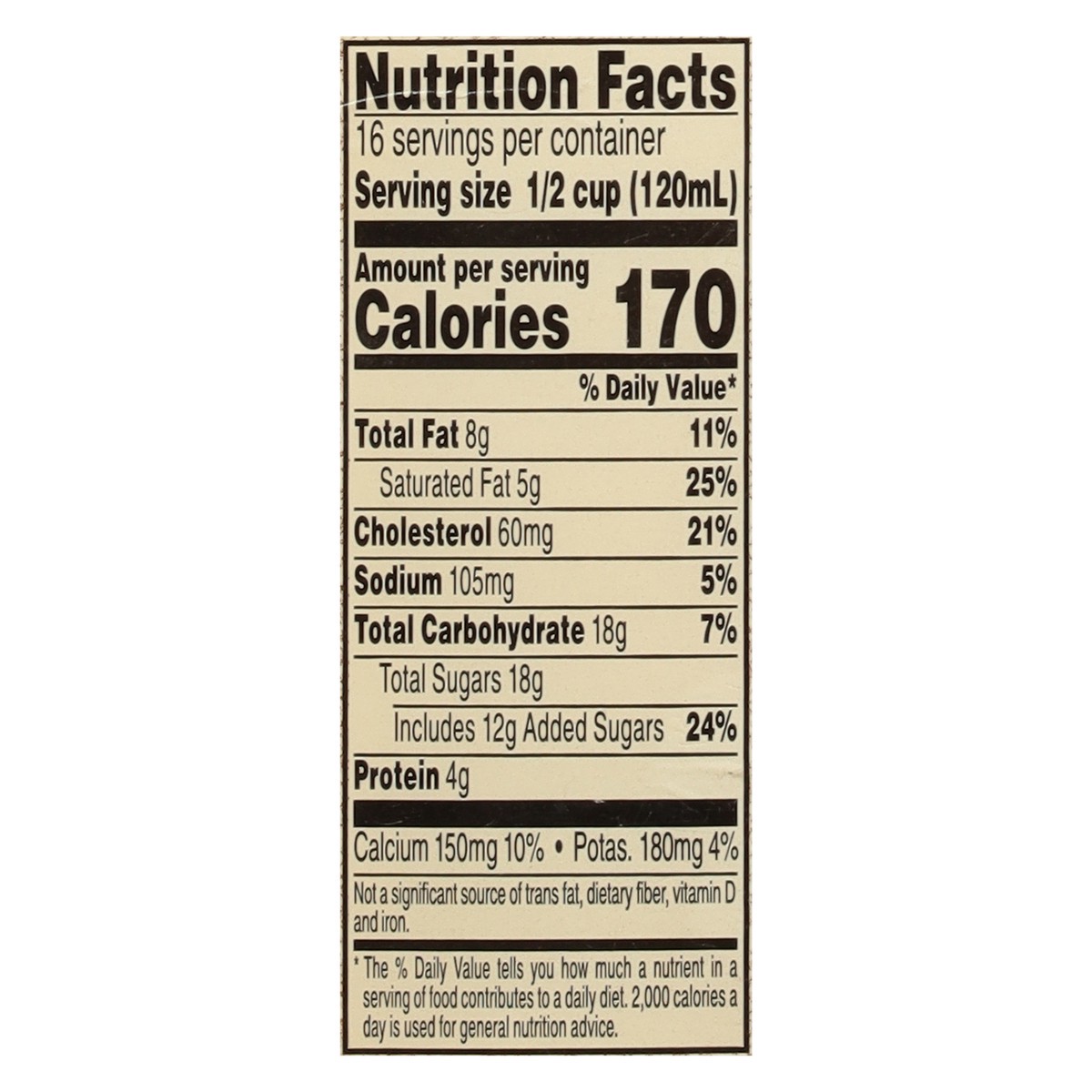Nonfat Milk, Cream, Sugar, High Fructose Corn Syrup, Egg Yolk, Contains Less than 1% of: Whey, Corn Starch, Guar Gum, Salt, Nutmeg, Carrageenan, Natural & Artificial Flavor, Turmeric and Annatto (Colo…