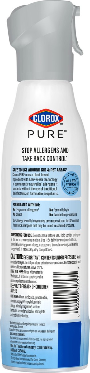 - NEW ALLERGEN NEUTRALIZER SPRAY: Clorox PURE Allergen Neutralizer Daily Air Spray is the only daily air spray to neutralize pet dander