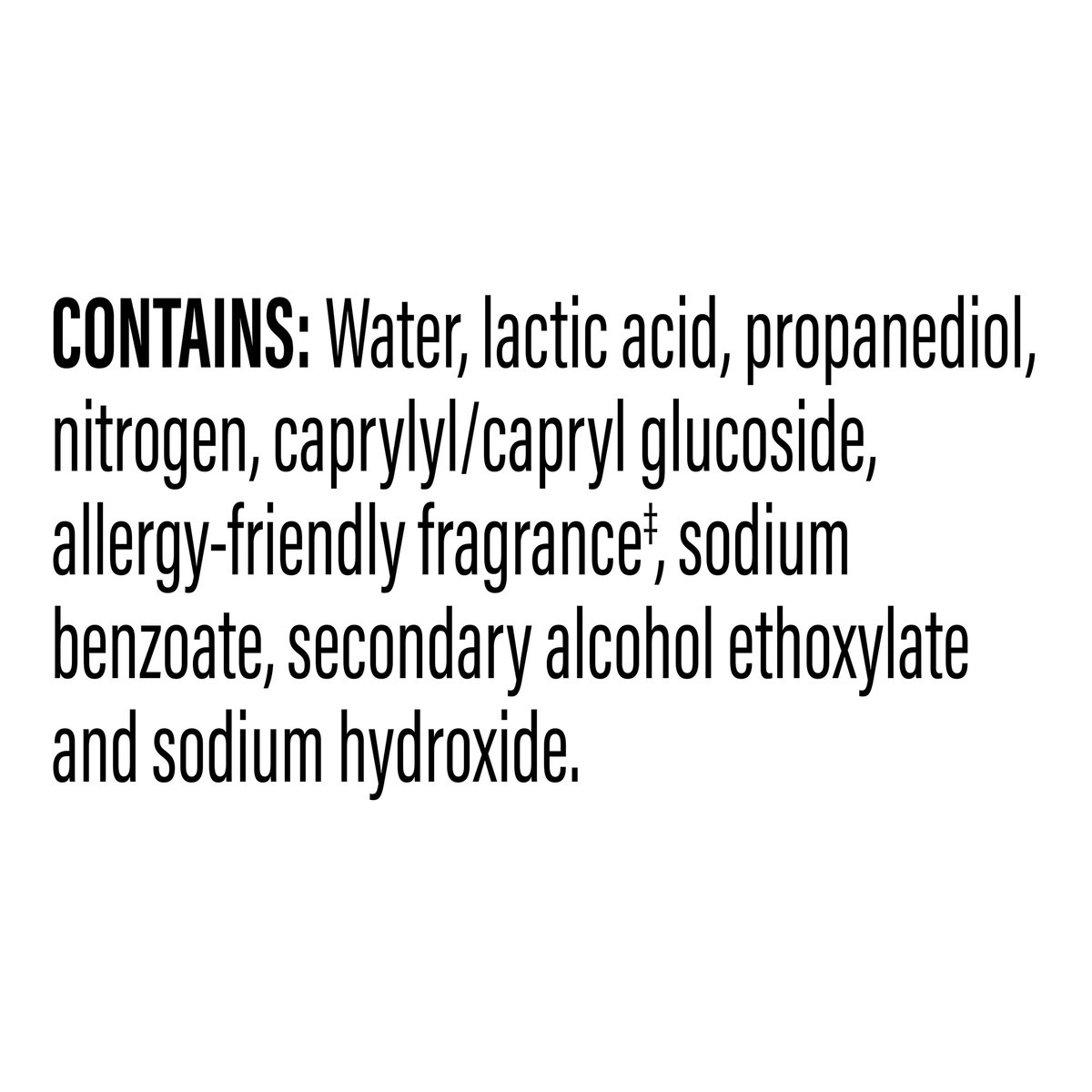 Contains: Water, Lactic Acid, Propanediol, Nitrogen, Caprylyl/Capryl Glucoside, Allergy-Friendly Fragrance(b), Sodium Benzoate, Secondary Alcohol Ethoxylate and Sodium Hydroxide. (b) Our Allergy-Frien…