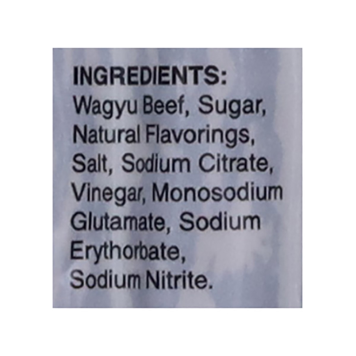 Wagyu Beef, Sugar, Natural Flavorings, Salt, Sodium Citrate, Vinegar, Monosodium Glutamate, Sodium Erythorbate, Sodium Nitrite.