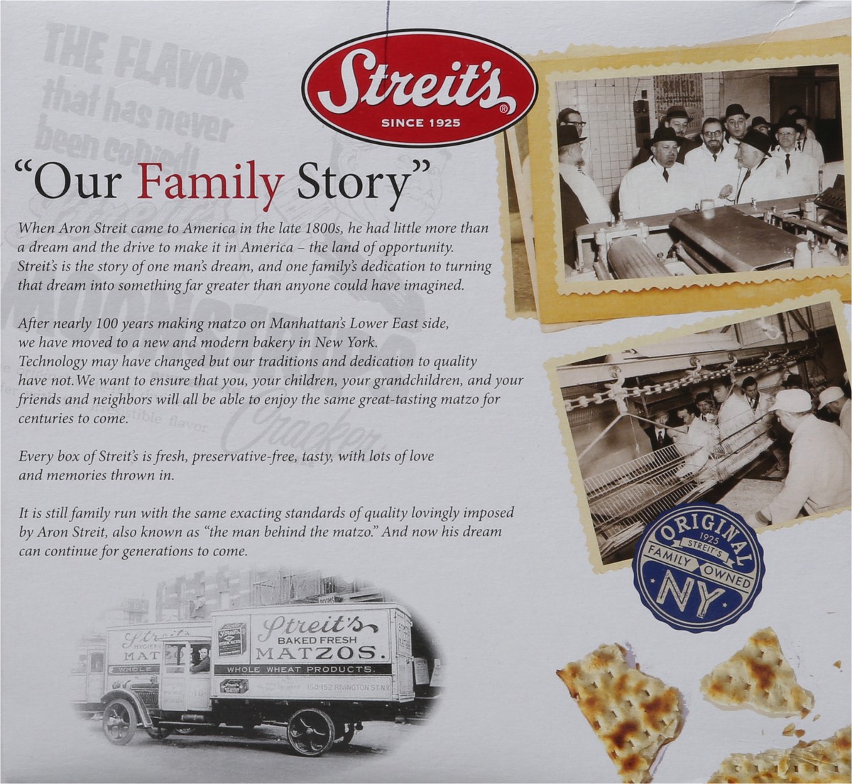Since 1925. Original 1925 family owned NY. The original cracker. Our Family Story: When Aron Streit came to America in the late 1800s, he had little more than a dream and the drive to make it in Ameri…