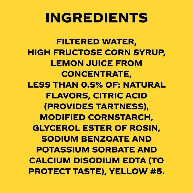 Filtered Water, High Fructose Corn Syrup, Lemon Juice from Concentrate, Less than 0.5% of: Natural Flavors, Citric Acid (Provides Tartness), Modified Cornstarch, Glycerol Ester of Rosin, Sodium Benzoa…