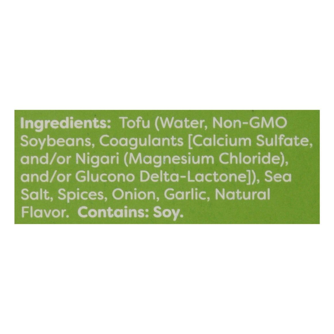Tofu (Water, Non-GMO Soybeans, Coagulants [Calcium Sulfate, and/or Nigari (Magnesium Chloride), and/or Glucono Delta-Lactone]), Sea Salt, Spices, Onion, Garlic, Natural Flavor.