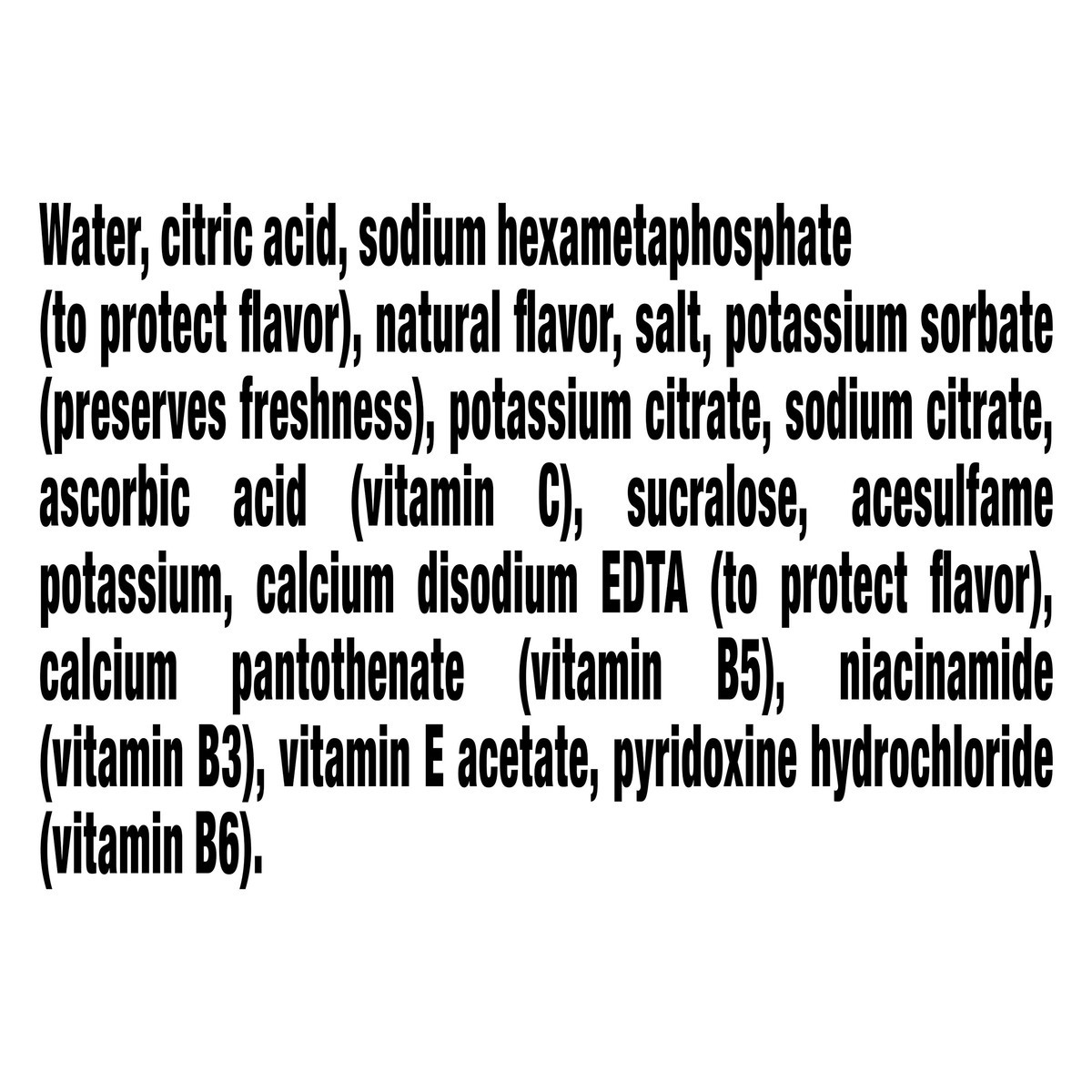 Water, Citric Acid, Sodium Hexametaphosphate (To Protect Flavor), Natural Flavor, Salt, Potassium Sorbate (Preserves Freshness), Potassium Citrate, Sodium Citrate, Ascorbic Acid (Vitamin C), Sucralose…