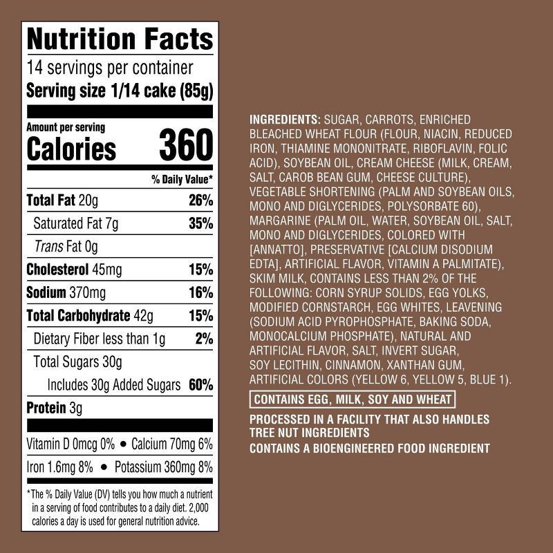 SUGAR, CARROTS, ENRICHED BLEACHED WHEAT FLOUR (FLOUR, NIACIN, REDUCED IRON, THIAMINE MONONITRATE, RIBOFLAVIN, FOLIC ACID), SOYBEAN OIL, CREAM CHEESE (MILK, CREAM, SALT, CAROB BEAN GUM, CHEESE CULTURE)…