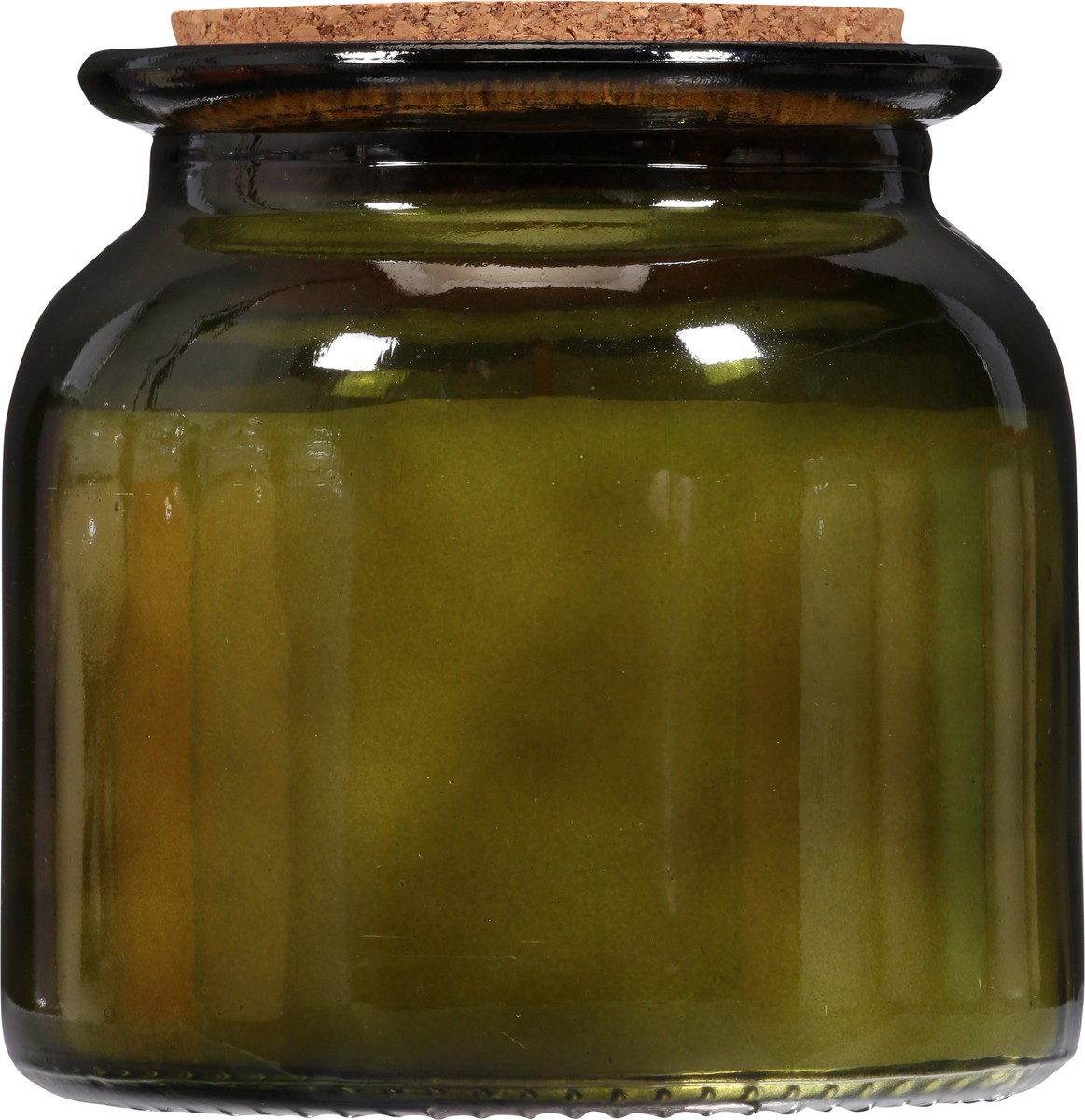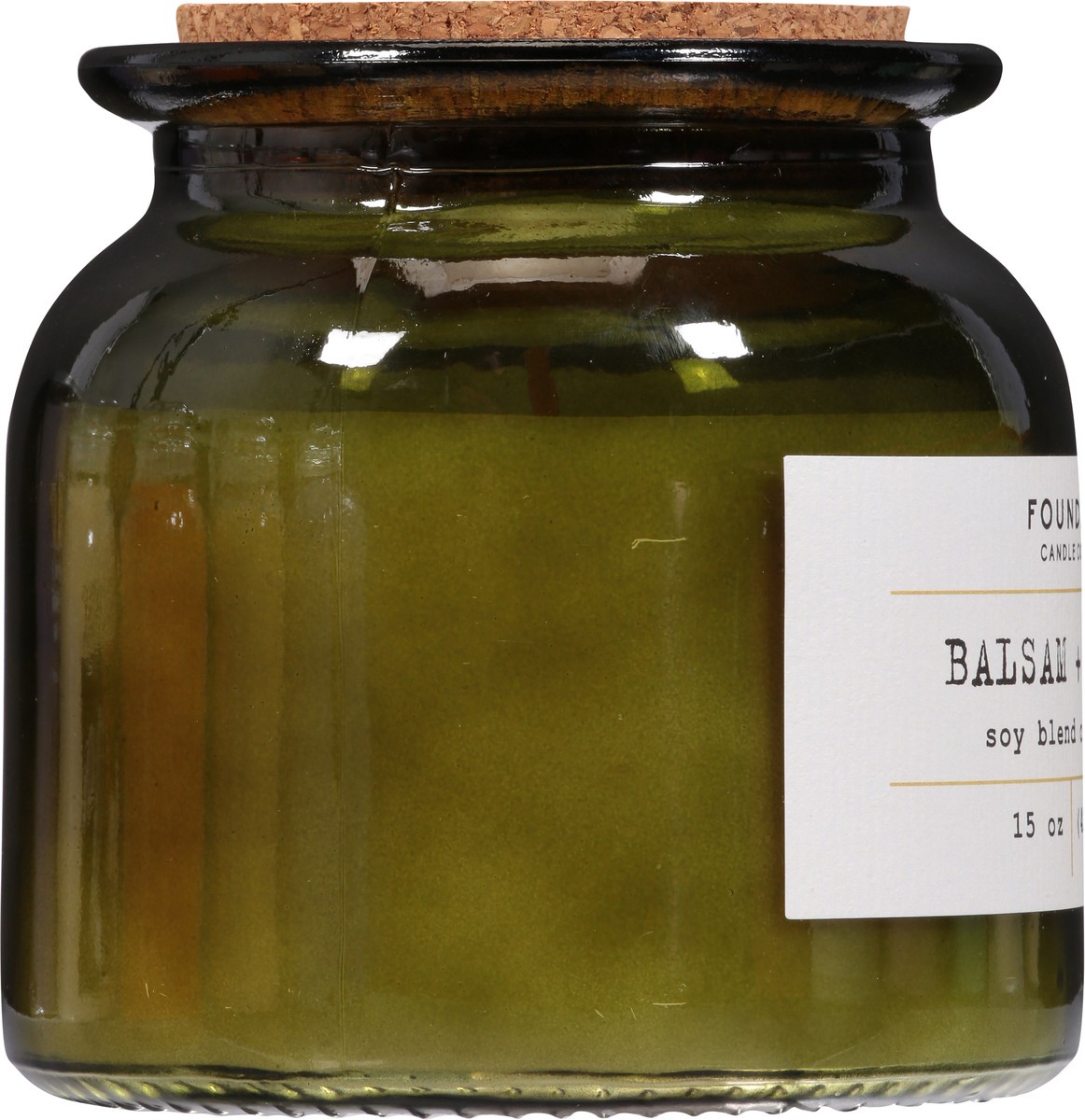 Foundry's Balsam + Pine 15 oz. soy-wax blended candle with a cotton wick features fresh fragrance notes of winter eucalyptus, juniper, and cedar. Our apothecary style transparent hunter green glass ja…