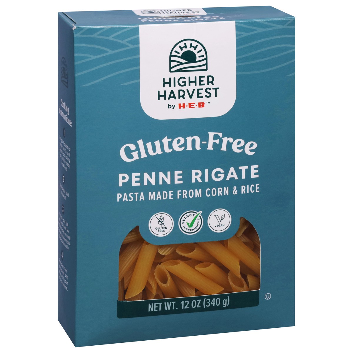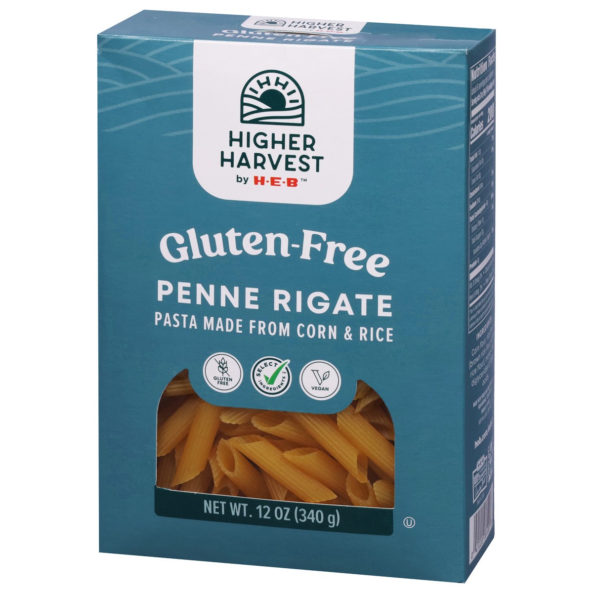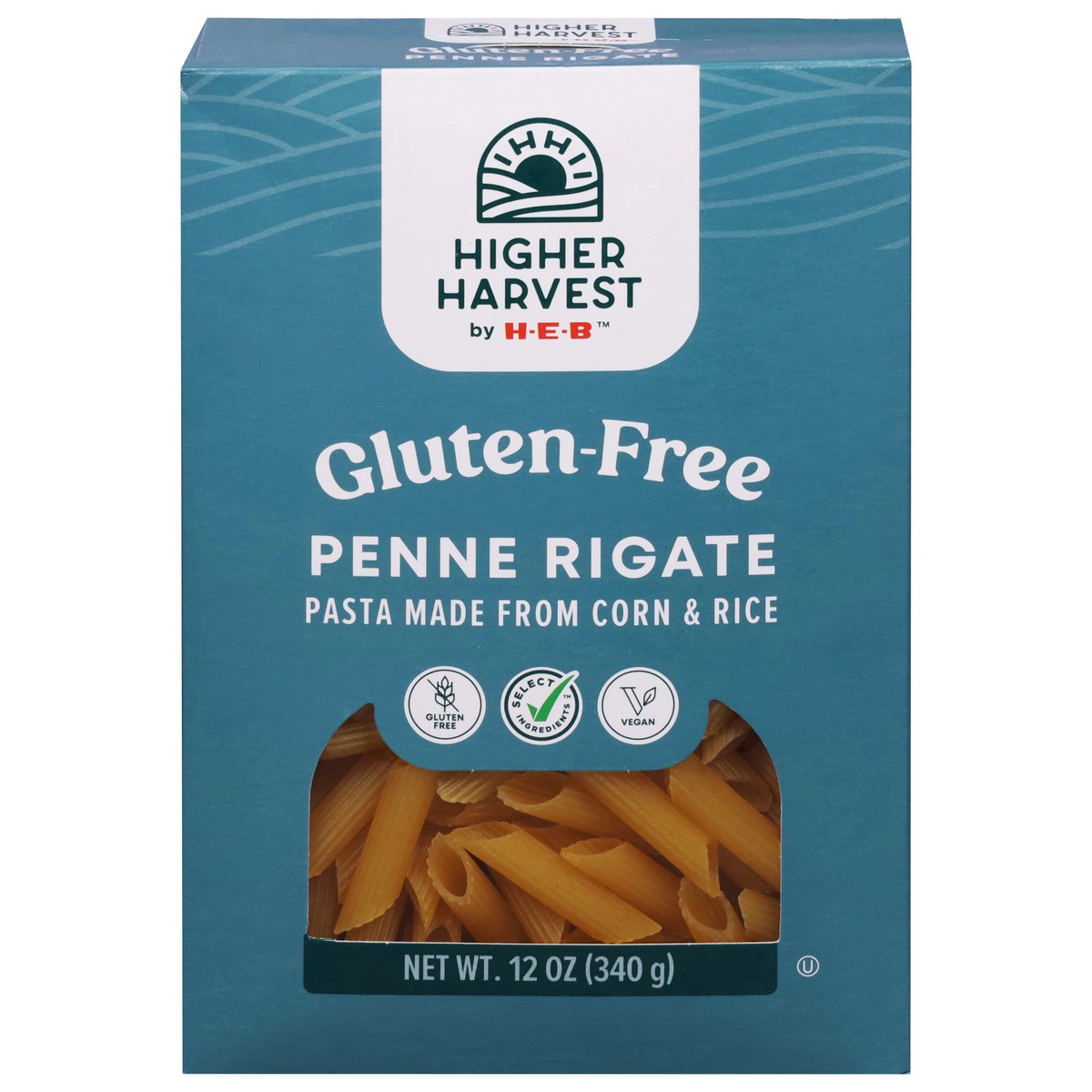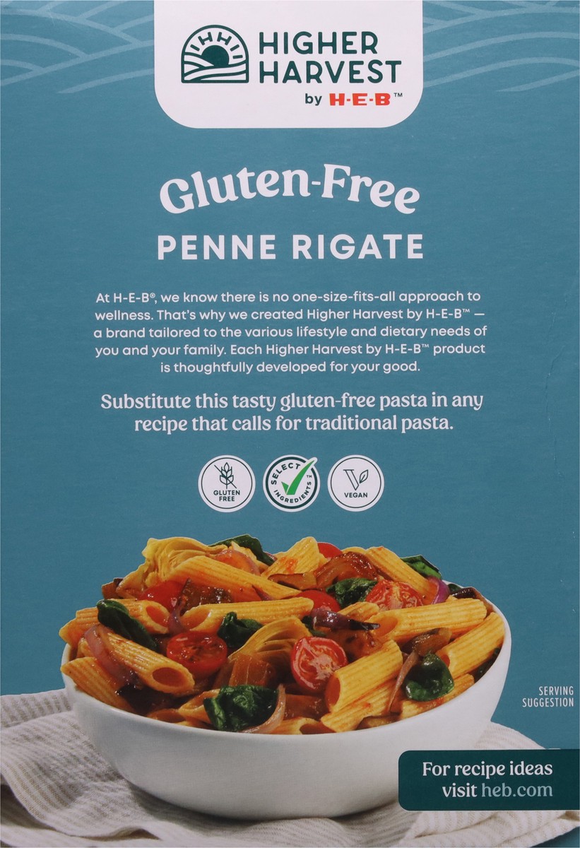 Made from corn and rice, Higher Harvest by H-E-B penne rigate noodles are both gluten-free and vegan. Recognizable by their cylinder shape and diagonally cut ends, this type of pasta is often just cal…