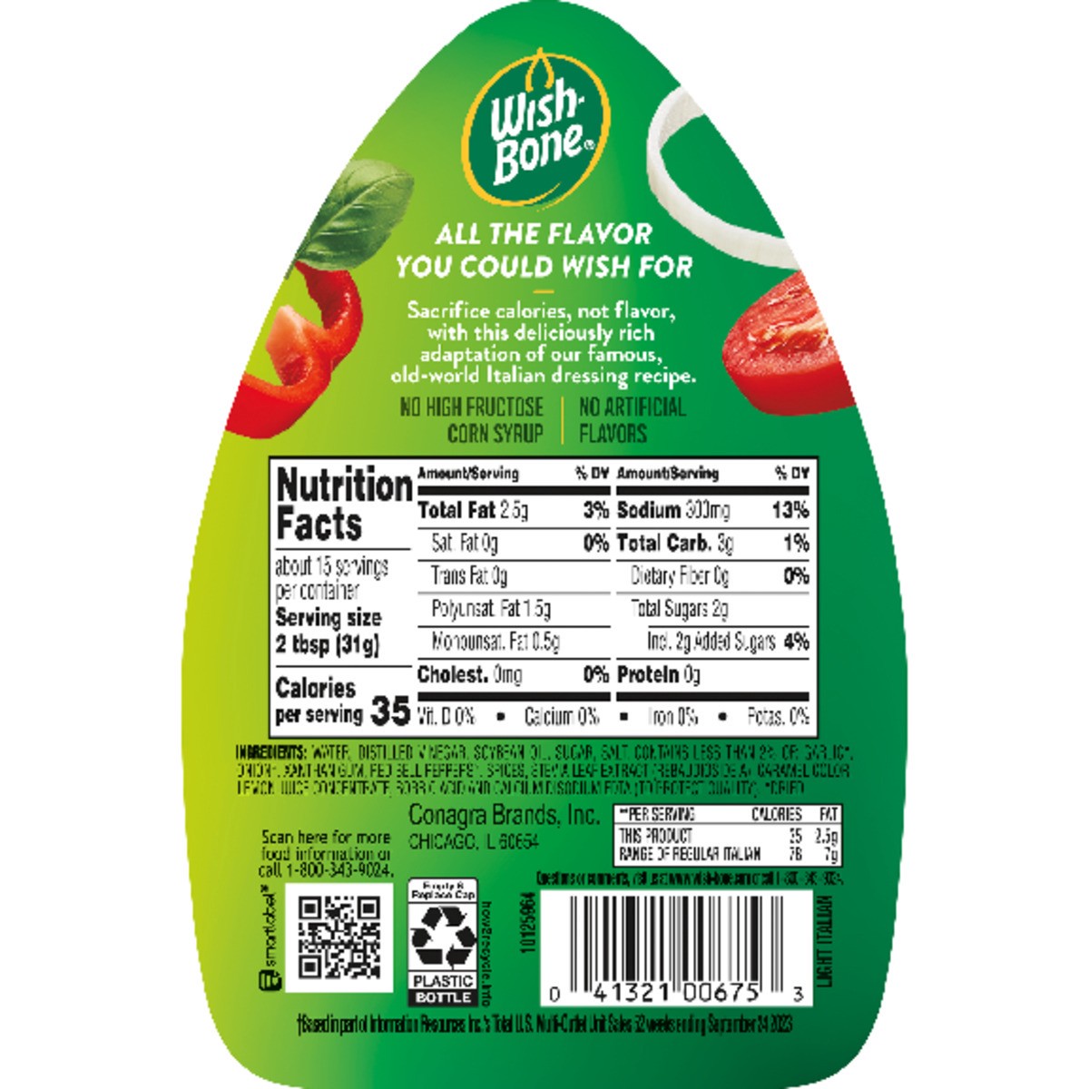Wish-Bone Light Italian Dressing adds rich flavor to all your favorite recipes. A delicious adaptation of Wish-Bone's old-world recipe, this light Italian salad dressing adds flavor to marinades, past…