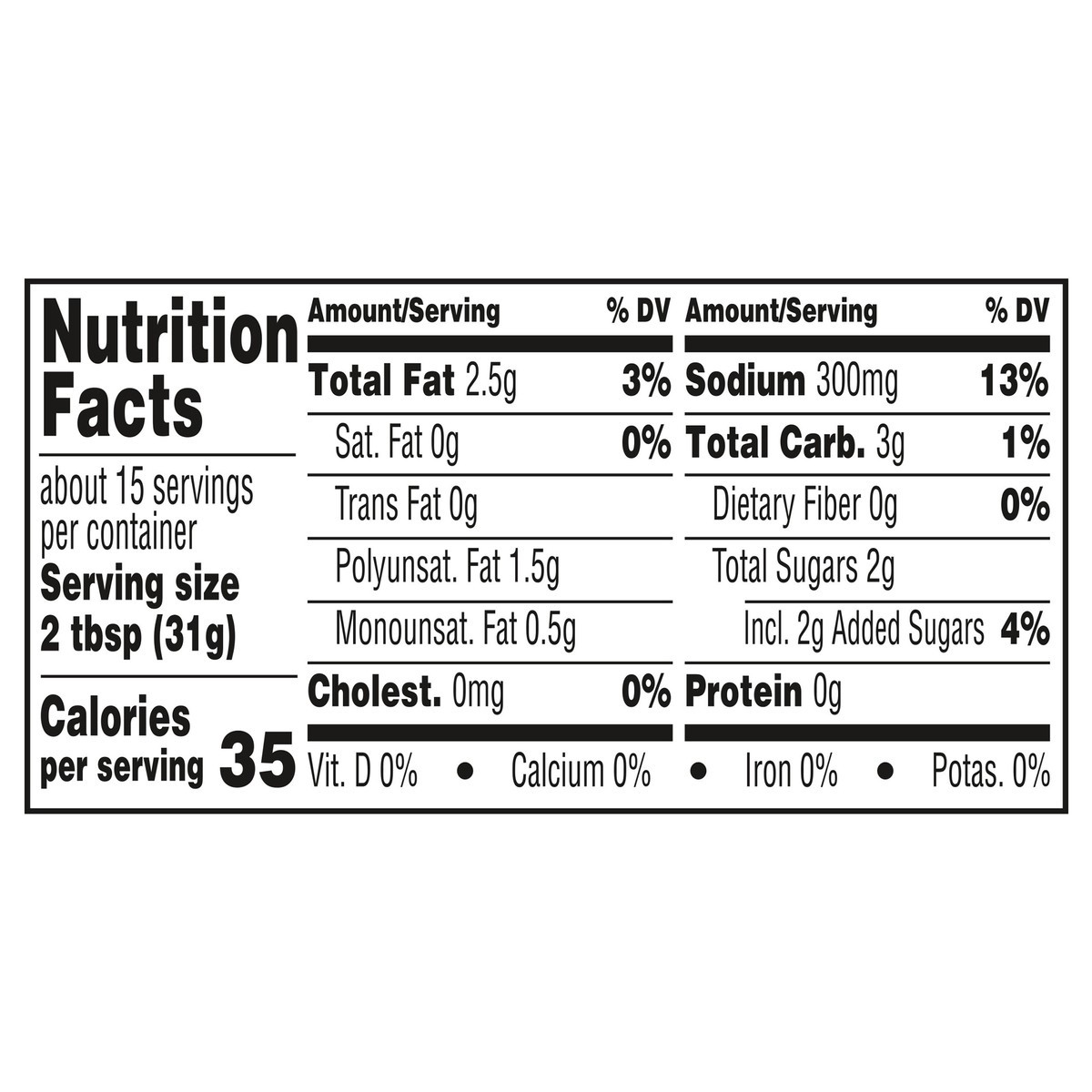 INGREDIENTS: WATER, DISTILLED VINEGAR, SOYBEAN OIL, SUGAR, SALT. CONTAINS 2% OR LESS OF: GARLIC*, ONION*, XANTHAN GUM, RED BELL PEPPERS*, SPICE, STEVIA LEAF EXTRACT (REBAUDIOSIDE A), LEMON JUICE CONCE…
