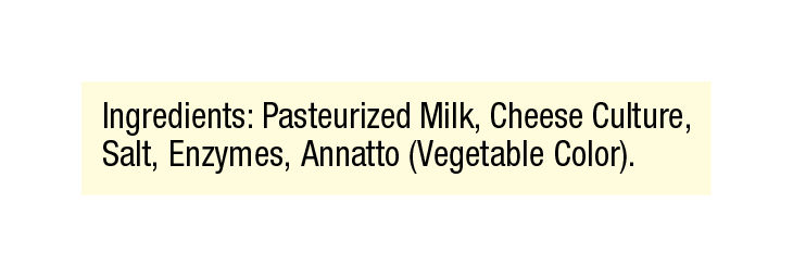 PASTEURIZED MILK, CHEESE CULTURE, SALT, ENZYMES, ANNATTO (VEGETABLE COLOR)