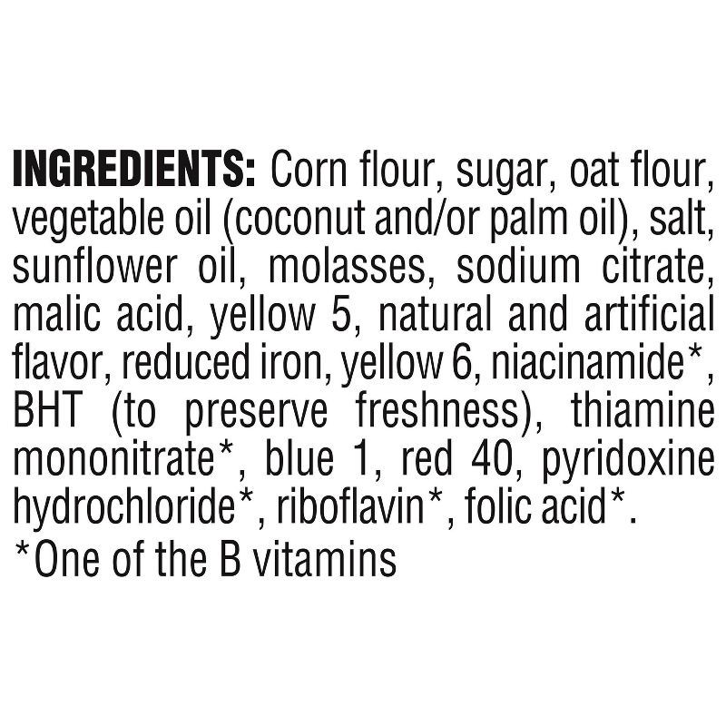 Corn Flour, Sugar, Oat Flour, Vegetable Oil (Coconut Oil And/Or Palm Oil), Salt, Sunflower Oil, Molasses, Sodium Citrate, Malic Acid, Yellow 5, Natural And Artificial Flavor, Reduced Iron, Yellow 6, N…