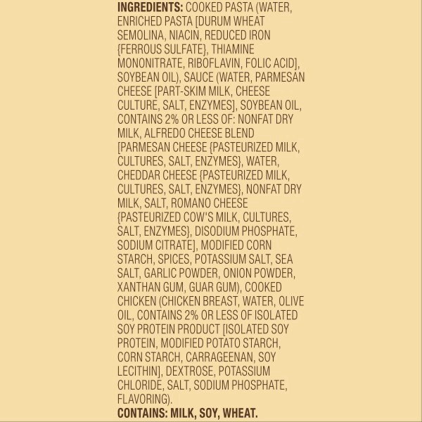 Cooked Pasta (Water, Enriched Pasta [Durum Wheat Semolina, Niacin, Reduced Iron (Ferrous Sulfate), Thiamine Mononitrate, Riboflavin, Folic Acid], Soybean Oil), Sauce (Water, Parmesan Cheese [Part-Skim…