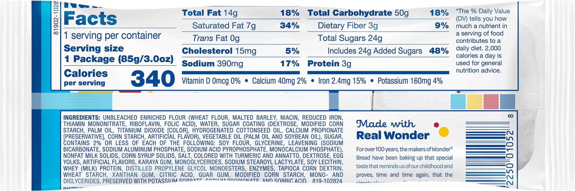 Unbleached Enriched Flour (Wheat Flour, Malted Barley, Niacin, Reduced Iron, Thiamin Mononitrate, Riboflavin, Folic Acid), Water, Sugar Coating (Dextrose, Modified Corn Starch, Palm Oil, Titanium Diox…