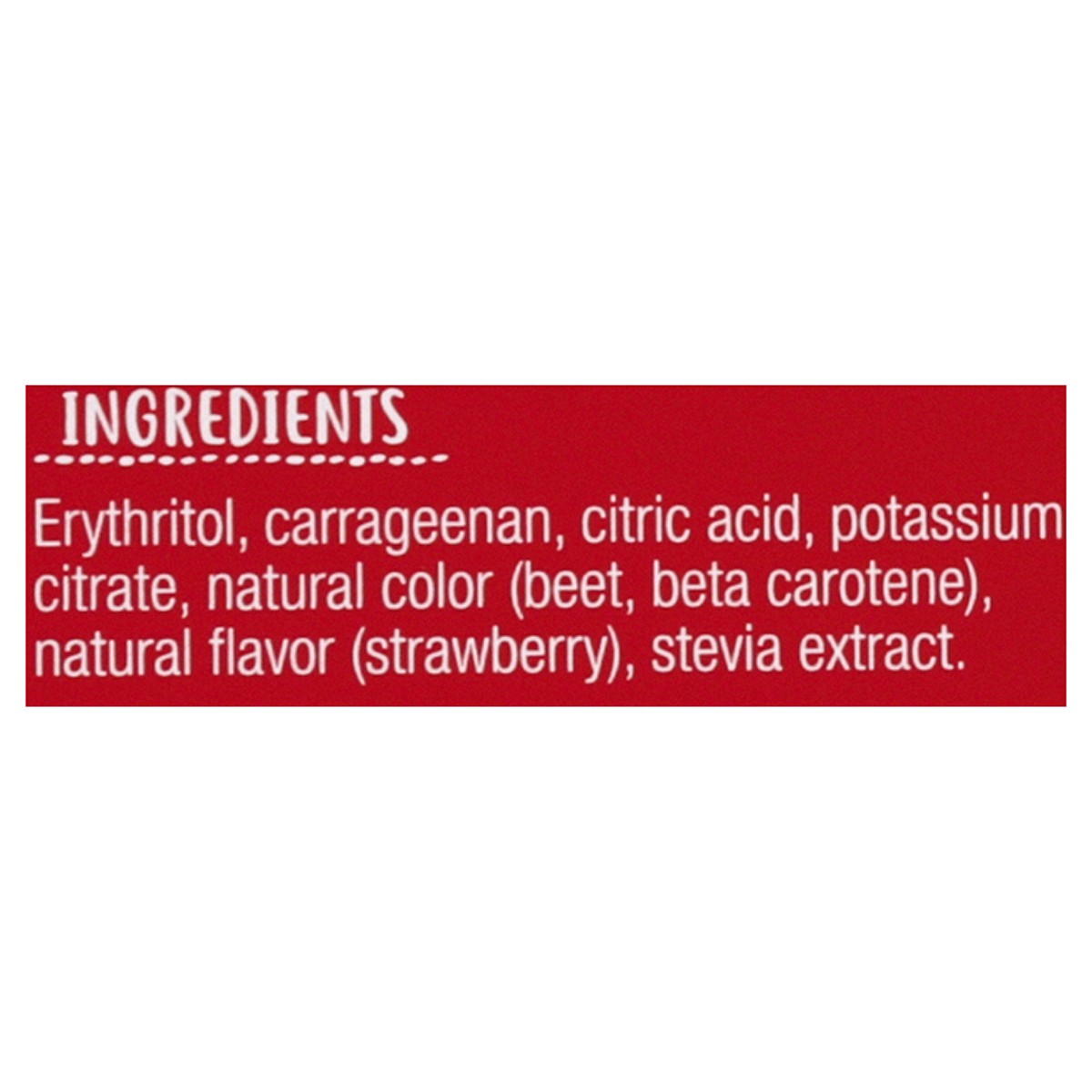 Erythritol, Carrageenan, Citric Acid, Potassium Citrate, Natural Color (Beet, Beta Carotene), Natural Flavor (Strawberry), Stevia Extract.