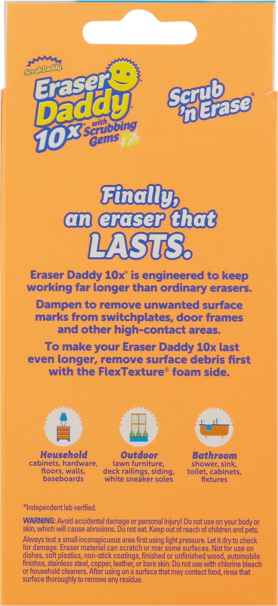 Dual-sided. 10 Times stronger to last 10 times longer. Scrub ''n erase. Finally, an eraser that lasts. Eraser Daddy 10x is engineered to keep working far longer than ordinary erasers. Dampen to remove…