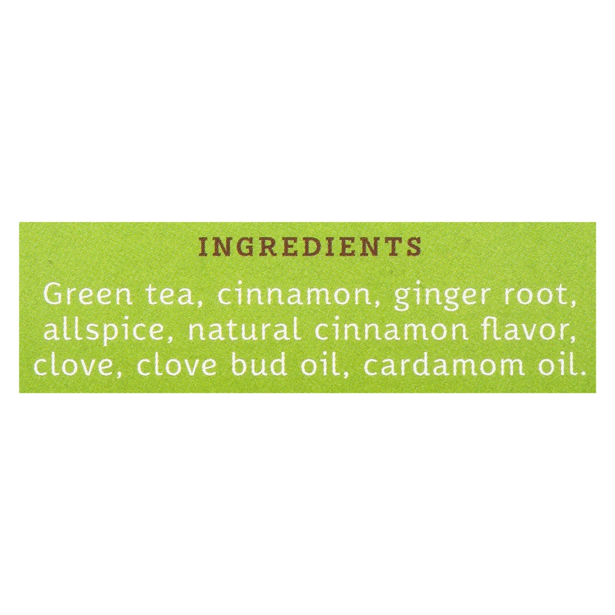 Green Tea, Cinnamon, Ginger Root, Allspice, Natural Cinnamon Flavor, Clove, Clove Bud Oil, Cardamom Oil.