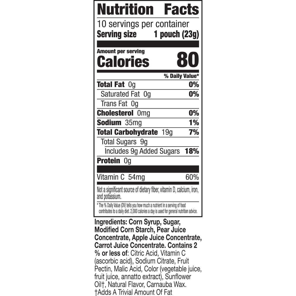 Corn Syrup, Sugar, Modified Corn Starch, Pear Juice Concentrate, Apple Juice Concentrate, Carrot Juice Concentrate. Contains 2% or Less of: Citric Acid, Vitamin C (Ascorbic Acid), Sodium Citrate, Frui…