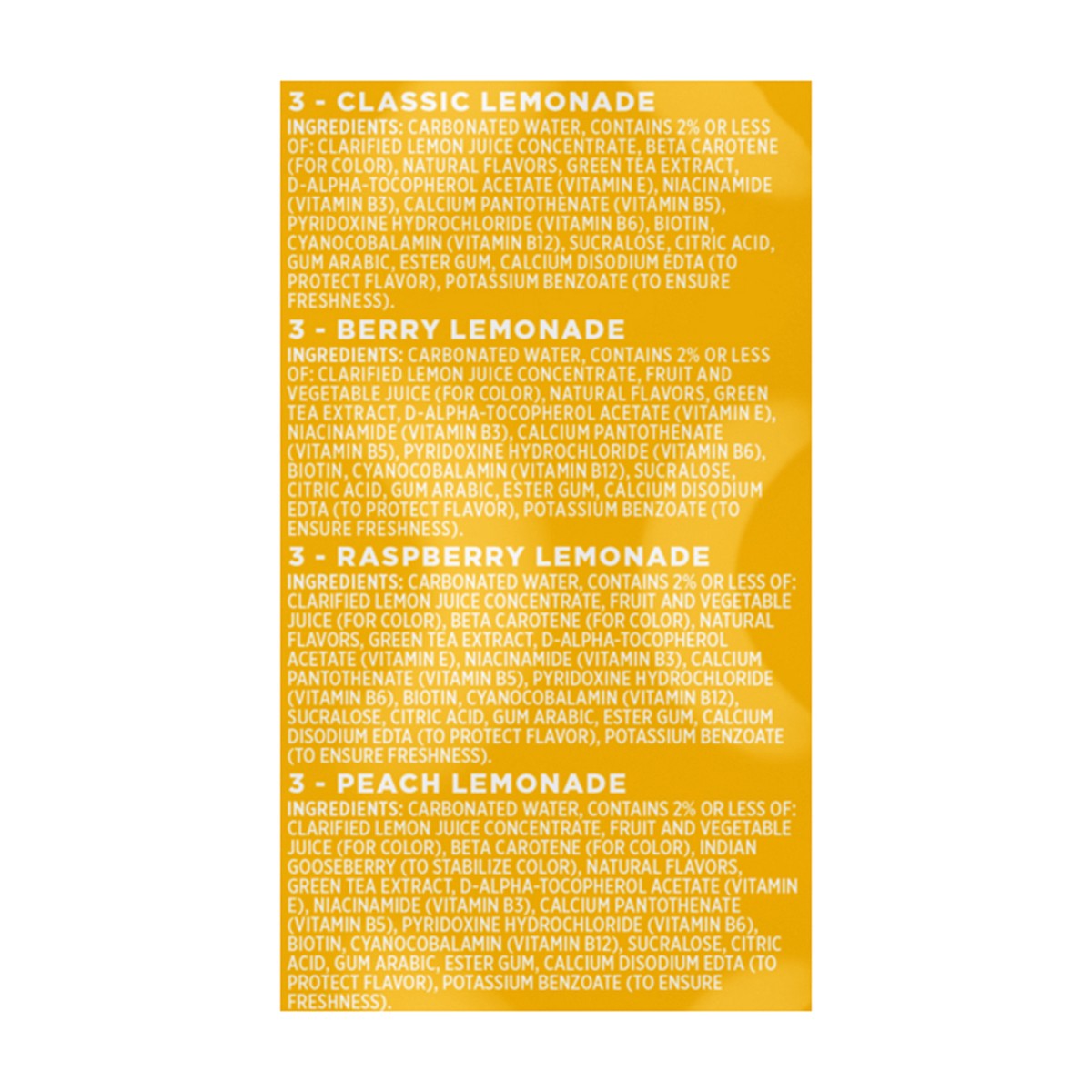 Classic Lemonade: Carbonated Water, Contains 2% or Less of: Clarified Lemon Juice Concentrate, Beta Carotene (for Color), Natural Flavors, Green Tea Extract, D-Alpha-Tocopherol Acetate (Vitamin E), Ni…