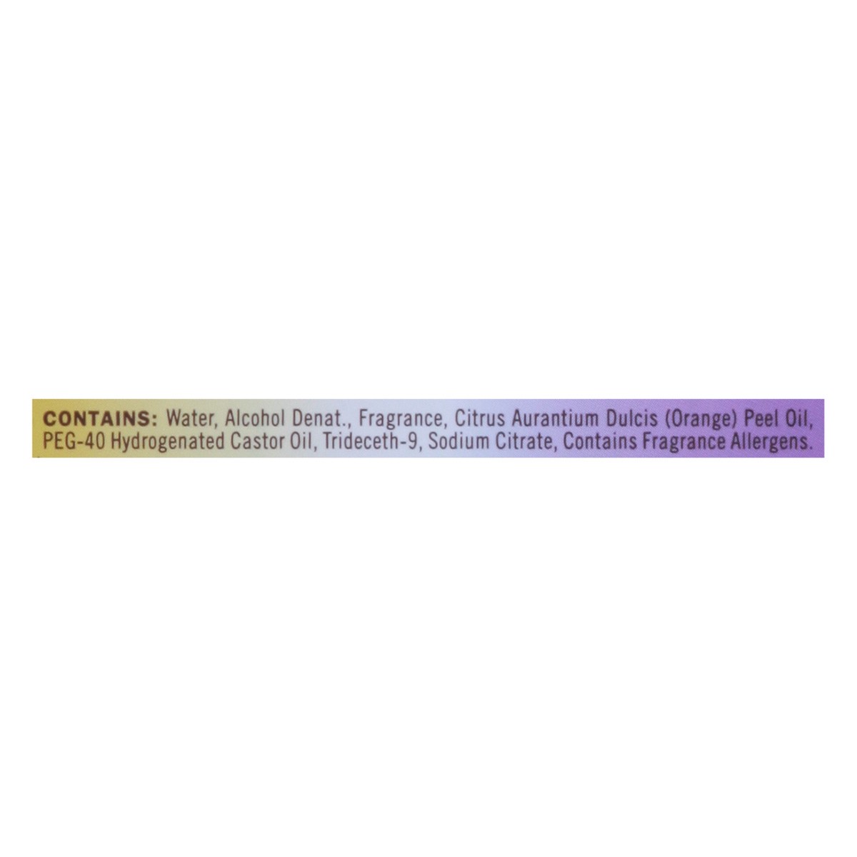 Water, Alcohol Denat., Fragrance, Citrus Aurantium Dulcis (Orange) Peel Oil, PEG-40 Hydrogenated Castor Oil, Trideceth-9, Sodium Citrate.