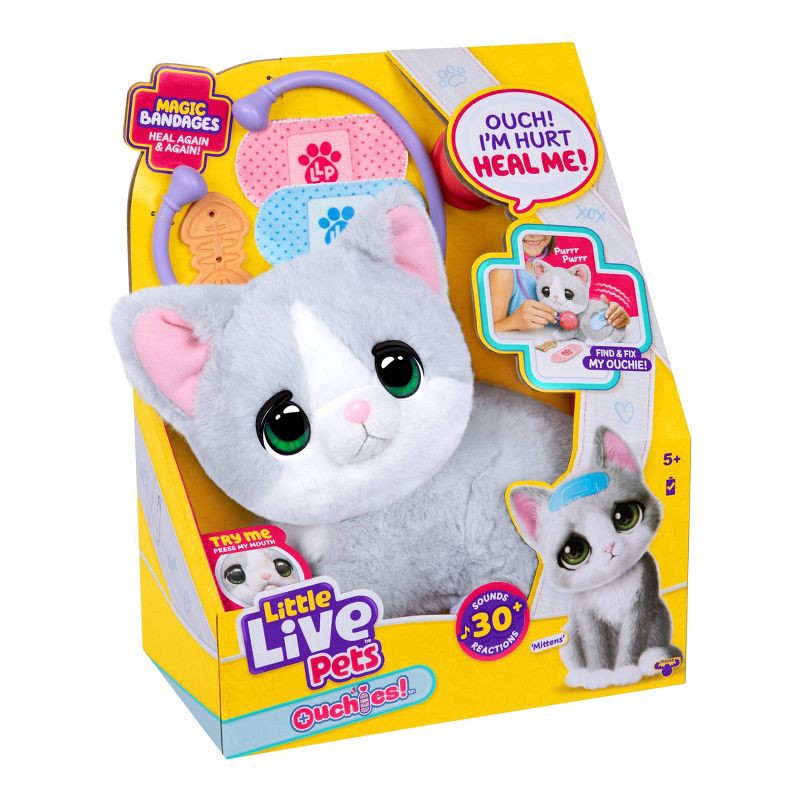 Little Live Pets Ouchies - Mittens The Kitten! This adorable kitten needs your love and care to feel better. Ouchies kitten starts off feeling unwell, shivering and shaking, and needs your help to hea…