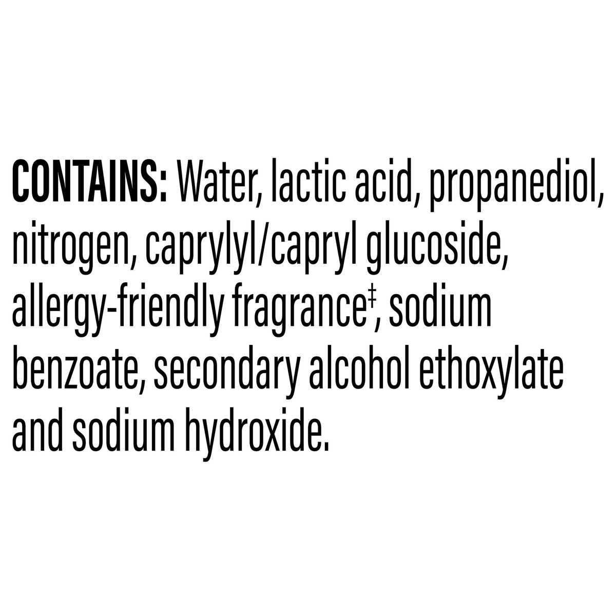 Contains: Water, Lactic Acid, Propanediol, Nitrogen, Caprylyl/Capryl Glucoside, Allergy-Friendly Fragrance(a), Sodium Benzoate, Secondary Alcohol Ethoxylate and Sodium Hydroxide. (a) Our Allergy-Frien…