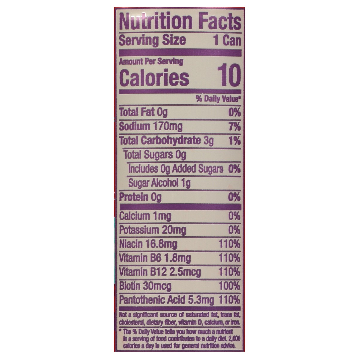 Carbonated Water, Citric Acid, Taurine, Erythritol, Sodium Citrate, Natural Flavor, Malic Acid, Vegetable Juice for Color, L-Theanine, Caffeine, Sucralose, Acesulfame Potassium, Panay Ginseng Root Ext…