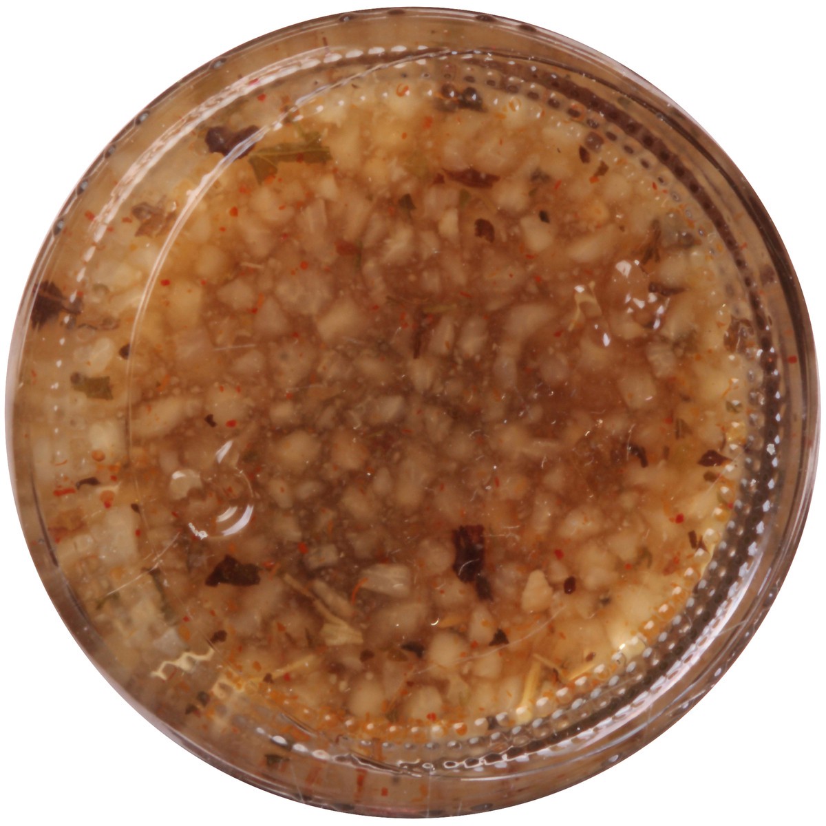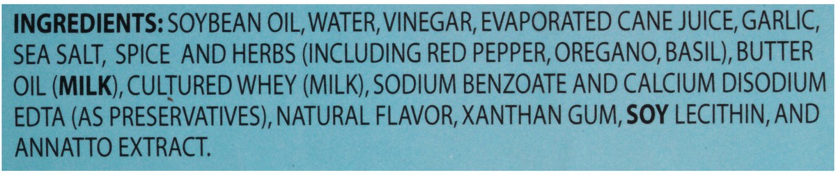 Soybean Oil, Water, Vinegar, Evaporated Cane Juice, Garlic, Sea Salt, Spice and Herbs (Including Red Pepper, Oregano, Basil), Butter Oil (Milk), Cultured Whey (Milk), Sodium Benzoate and Calcium Disod…