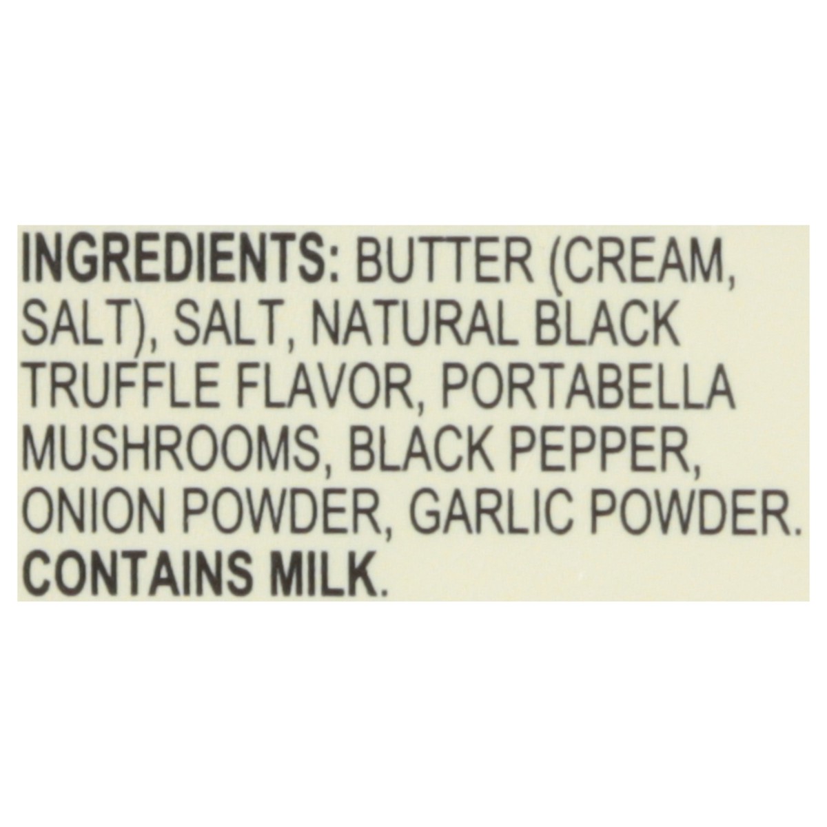 Butter (Cream, Salt), Salt, Natural Black Truffle Flavor, Portabella Mushrooms, Black Pepper, Onion Powder, Garlic Powder.